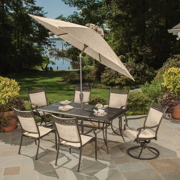Home Styles Largo 8PC Dining Set w/ Umbrella and Cushions from c.shld.net Aluminum outdoor dining set with umbrella hole. Check spelling or type a new query. Maybe you would like to learn more about one of these? We did not find results for: